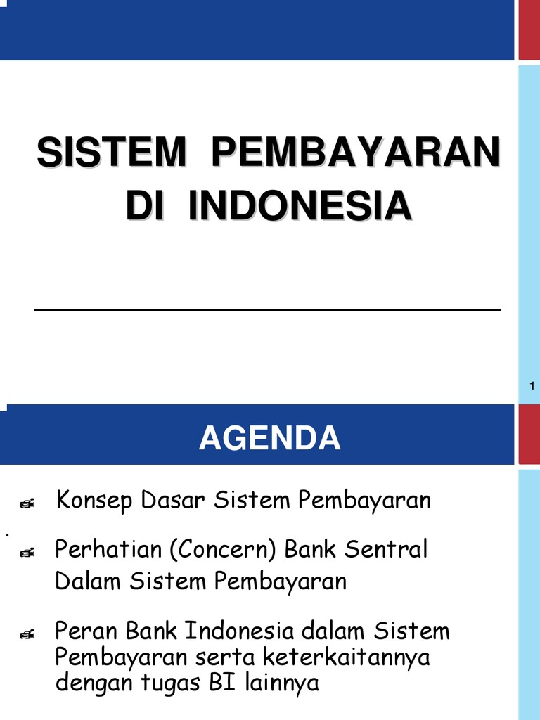 Infrastruktur Sistem Pembayaran (PIP), who provide infrastructure to facilitate fund transfers. 1 PBI stands for Peraturan Bank Indonesia ...5 pages Menurut Bank Indonesia pada UU No. 23 tentang Bank Indonesia pasal 1 mendefinisikan secara tegas mengenai sistem pembayaran yang merupakan satu kesatuan yang utuh dari seperangkat aturan, lembaga, mekanisme untuk melaksanakan pemindahan dana guna memenuhi kewajiban yang timbul dari kegiatan ekonomi. Direktorat Akunting dan Sistem Pembayaran Biro Pengembangan Sistem Pembayaran Nasional Bank Indonesia, Instrumen Pembayaran (Bank Indonesia). Ellinger E.P, Modern Banking Law (Oxford 1994). Frieda Husni Hasbullah dan Surini Ahlan Syarif, Materi Perkuliahan Buku Ajar : Hukum Kebendaan Perdata (Fakultas Hukum Universitas Indonesia 2001).