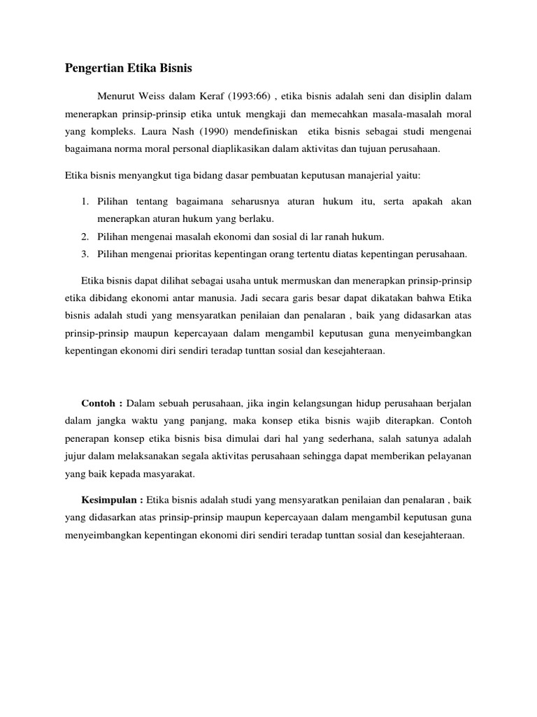 Apa yang dimaksud dengan etika bisnis. Definisi Etika Dan Bisnis Sebagai Sebuah Profesi ... ETIKA DAN BISNIS SEBAGAI SEBUAH PROFESI Bisinis Sebagai Profesi Luhur Sesungguhnya bisnis bukanlah merupakan profesi, kalau bisnis dianggap sebagai pekerjaan kotor, kedati kata profesi, profesional dan profesionalisme sering begitu diobral dalam kaitan dengan kegiatan bisnis. Namun dipihak lain tidak dapat disangkal bahwa ada banyak orang bisnis dan juga perusahaan yang sangat menghayati ... Etika Bisnis Dalam Islam - Pengertian, Prinsip dan Contoh Dalam sebuah bisnis, ada yang namanya etika yang digunakan untuk melakukan seluruh kegiatan bisnis yang mencakup semua aspek yang berhubungan langsung dengan individu, perusahaan, industri dan kalangan masyarakat. Namun ada juga yang namanya etika bisnis dalam Islam yang juga harus diketahui. Bagaimana penjelasan lengkapnya? blog.amurya.com › mengapa-etika-bisnis-diperlukanMengapa Etika Bisnis Diperlukan? Oalah Ini Toh Alasannya Apr 06, 2021 · Bahkan, perlu anda ketahui para pebisnis besar memulai semua usahanya dengan etika yang baik. Sehingga, mereka bisa membuat gurita bisnis yang besar. Tanpa adanya etika tersebut, tentu mereka tidak akan bisa menjalankan bisnis tersebut dengan baik. Lalu, apa saja alasan mengapa etika bisnis diperlukan? Baca lebih lengkapnya dibawah ini. Apa itu etika bisnis dan perannya di dalam perusahaan Apa yang Dimaksud dengan Etika Bisnis | Definisi Etika Bisnis Etika bisnis pada dasarnya adalah sebuah studi yang mempelajari tentang kebijakan dan praktik bisnis yang bersih dan beretika. Tujuannya adalah menjaga persaingan sehat dan seimbang baik untuk industri sejenis maupun secara luas.