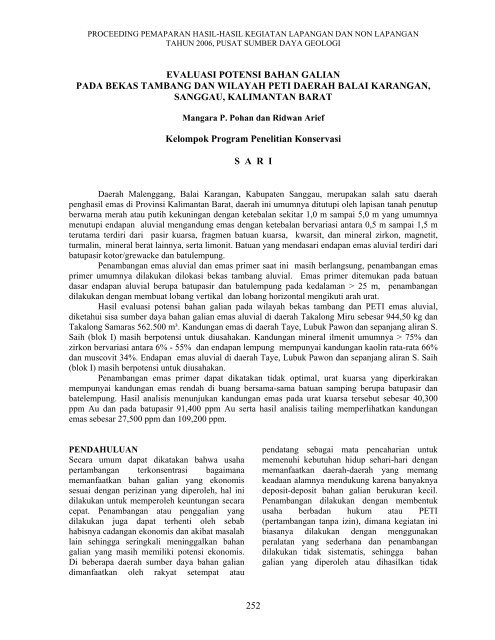 Semua Tentang Makalah: Makalah Pertambangan Pada pertambangan banyak sekali kecelakaan yang terjadi dan penyebabnya juga banyak, yaitu: 1. Bahaya pada peralatan: a) peralatan yang tidak sesuai dan tidak memenuhi syarat. b) peralatan yang tidak aman. c) peralatan yang tidak tertutup tidak dilindungi. 2. Bahaya lingkungan : a) becek, licin, lumpur, bermuara. PDF Bab Iii Kasus Pertambangan Emas Di Gunung Pongkor ... Penambangan Emas Tanpa Ijin (PETI) dan semakin lama jumlah gurandil akan semakin banyak. Pihak keamanan pernah memberikan sanksi bagi para gurandil yang tertangkap, namun para gurandil melakukan unjuk rasa pada PT Aneka Tambang (ANTAM) Tbk Unit Bisnis Pertambangan Emas (UBPE) Pongkor.Hal ini menimbulkan kerugian yang jauh lebih besar lagi ... makalah: 2010 - Blogger PENAMBANG TANPA IZIN (PETI) 1. PETI di bekas lokasi penambangan emas PT. Ampalit Mas Perdana (PT . AMP) di Kasongan, Kabupaten Sampit, Kalimantan Tengah. PT. AMP yang mempunyai Kontrak Karya seluas 10.745 ha mulai beroperasi sejak tahun 1994 menambang emas. Produksinya bulan Januari 1994 mencapai 139,3 kg, 1995 menjadi 296,8 kg dan 1996