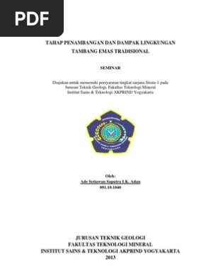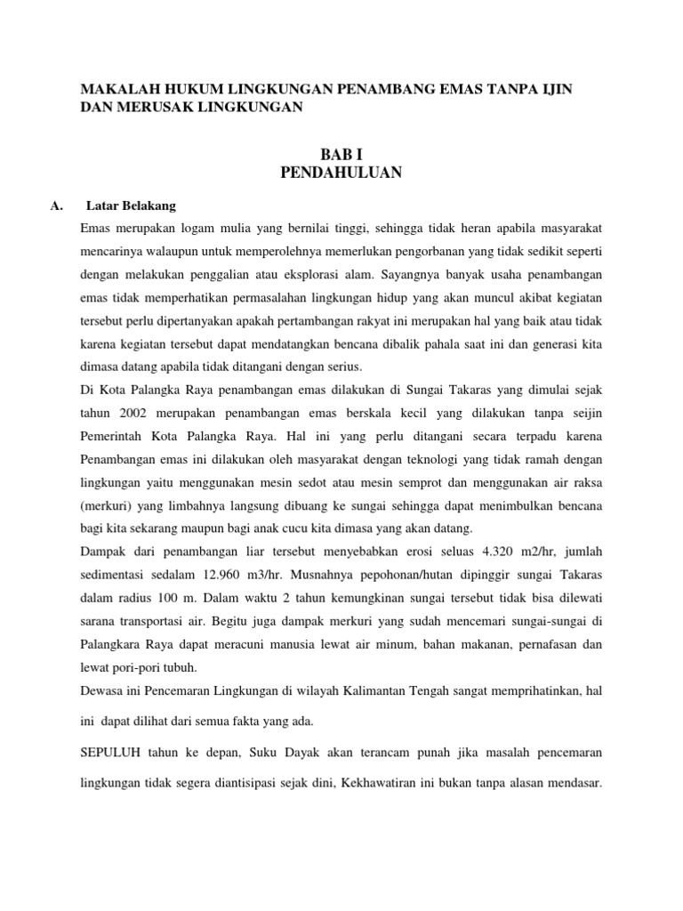 Makalah Penambangan Emas Tanpa Izin - Cerita Berita Info Makalah Penambangan Emas Tanpa Izin. Penambangan Emas Tanpa Izin. Anggota Kelompok : 1)Irna Febrindo; 2)Ismadi; 3)Dewi Hera Setyati. BAB I. PENDAHULUAN. A.Latar Belakang. Saat ini fenomena kerusakan lingkungan terjadi di seluruh sektor, salah satunya adalah sektor pertambangan. Pertambangan sebagai industri yang mempunyai resiko lingkungan yang ...