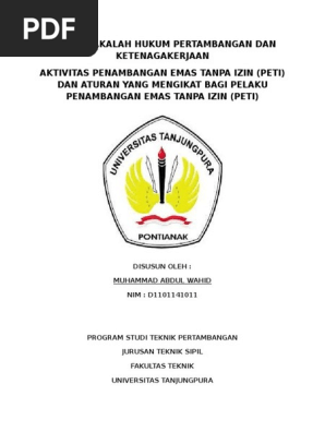 PDF PENYELESAIAN KASUS PENAMBANGAN PASIR ILEGAL (Studi Kasus ... makalah dan hasil penelitian. Data Tersier bahan-bahan yang bersifat menunjang data ... tambang. Bahan tambang itu meliputi emas, perak, tembaga, minyak, gas bumi, batu ... Bahkan kegiatan pertambangan tanpa izin ini merupakan faktor timbulnya kerusakan lingkungan yang tidak terkendali serta masalah-masalah lainnya. DAMPAK LIMBAH PENAMBANGAN EMAS TANPA IZIN.docx - DAMPAK ... DAMPAK LIMBAH PENAMBANGAN EMAS TANPA IZIN (PETI) TERHADAP KUALITAS AIR SUNGAI LIMUN KABUPATEN SAROLANGUN PROPINSI JAMBI Daerah penelitian terletak di desa Muaro Limun, Kecamatan Limun Kabupaten Sarolangun Provinsi Jambi. Sungai limun, salah satu sungai besar di daerah kabupaten sarolangun yang dimanfaatkan oleh mayarakat sekitarnya sebagai sumber penghidupan.