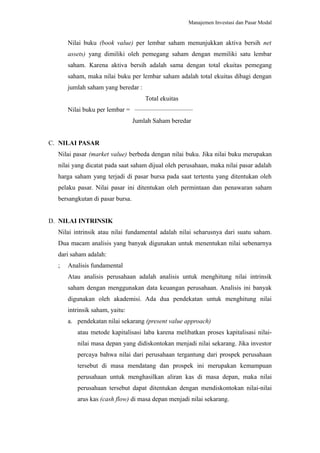 Analisa Penilian Saham - Nilai yang Berkaitan dengan Saham Nilai buku per lembar saham ( book value per share ) tidak menunjukan ukuran kinerja saham yang penting, tetapi nilai buku per lembar saham dapat mencermi kan berapa besar jaminan yang akan diperoleh oleh pemegang saham apabila perusahaan penerbit saham ( emiten ) dilikuidasi.