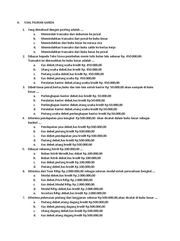Contoh Soal Akuntansi Perusahaan Jasa dan ... - E-KELAS.COM e. Perlatan kantor di debet dan piutang usaha di kredit (Rp 450.000,00) 17.Dibeli perlengkapan kantor Rp 50.000,00, maka akan tampak di buku besar. a.Perlengkapan kantor debet, kas kredit Rp 50.000,00. b.Peralatan kantor debet, kas kredit Rp 50.000,00. c. Perlengkapan kantor debet, utang usaha kredit Rp 50.000,00