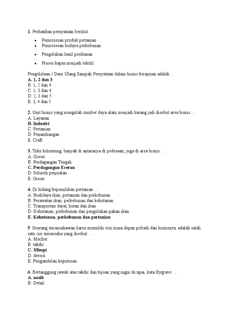 Soal Kewirausahaan (KWU) Kelas 12 SMA/MA dan Kunci Jawaban Bahan untuk mengantisipasi risiko bisnis Ketika memilih pekerjaan, pengusaha biasanya mencari ……….. A. sangat sederhana dan murah B. Tidak ada risiko tetapi hasilnya terbatas C. Pilih level Riseko sambil tetap menantang D. Risiko tinggi, tetapi untungnya bagus E. Murah dan tentukan harga barang Jawaban : D. 20.
