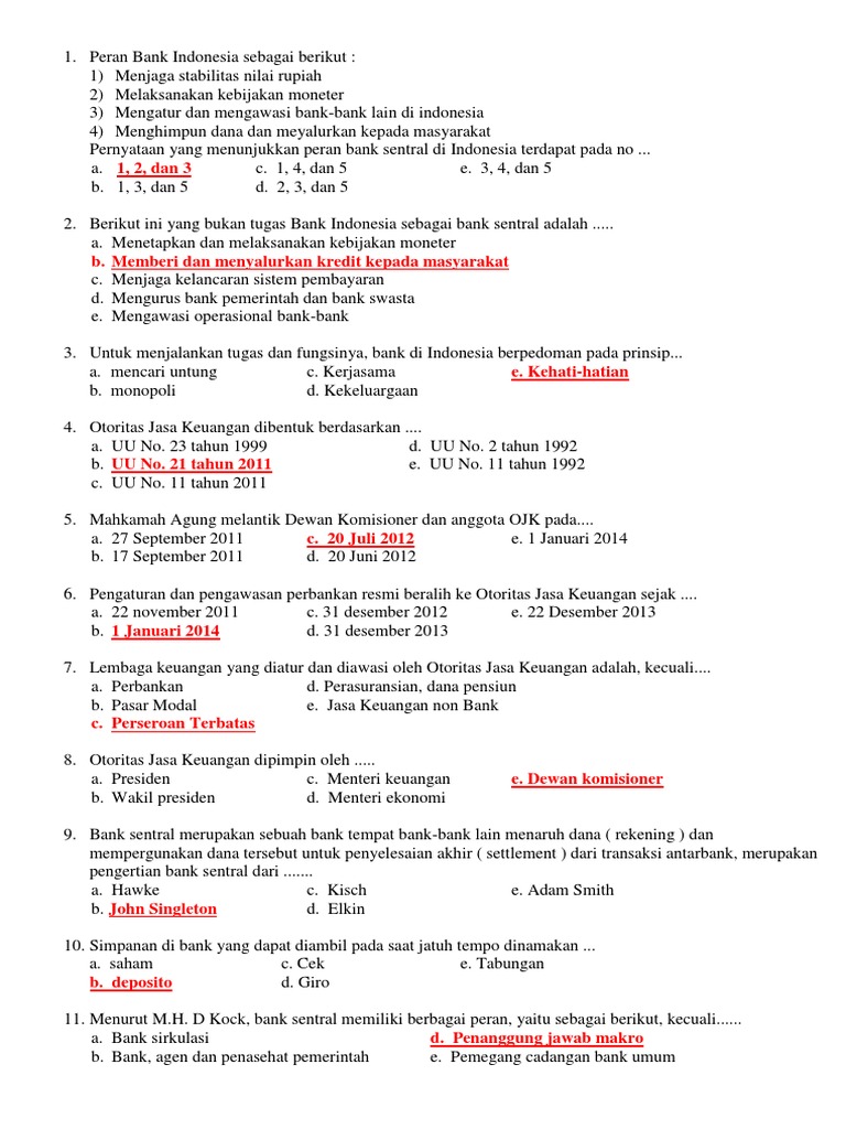 Contoh Soal PG Sejarah Indonesia Kelas XI Materi Peran ... BACA JUGA: Soal Sejarah Indonesia Kelas XI SMA Materi Peran dan Nilai Perjuangan Bung Karno dan Bung Hatta Sebagai Proklamator 7. Sejak mahasiswa, tokoh ini aktif dalam memperjuangkan kemerdekaan Indonesia melalui beberapa organisasi seperti Jong Java dan Persatuan Mahasiswa Indonesia di Belkalian. Peranan dan Tujuan Bank Indonesia sebagai Bank Sentral ... Di Indonesia, peran sebagai bank sentral dipegang oleh Bank Indonesia (BI). Sebagai Bank Sentral, Bank Indonesia memiliki cabang di hampir tiap provinsi di Indonesia. Fungsi utama bank sentral adalah mengatur masalah-masalah yang berhubungan dengan keuangan di suatu negara secara luas, baik ke dalam maupun ke luar negeri. Peran dan Fungsi Bank Indonesia sebagai Bank Sentral Sebagai bank sentral, Bank Indonesia memegang beberapa peranan yang penting dalam sistem keuangan di Indonesia, hubungannya dengan pemerintah, dan hubungannya dengan dunia internasional yang dapat dilihat dari tugas dan fungsi yang dimiliki. Adapun peran dan fungsi Bank Indonesia adalah sebagai berikut : 1. Penjaga Stabilitas Moneter Implementasi Basel BCBS adalah salah satu komite dalam Bank for International Settlements (BIS) yang berperan menetapkan standar pengaturan perbankan dan sebagai forum kerjasama terkait dengan pengawasan perbankan. BCBS terdiri atas 45 Bank Sentral dan Otoritas pengawasan bank dari …