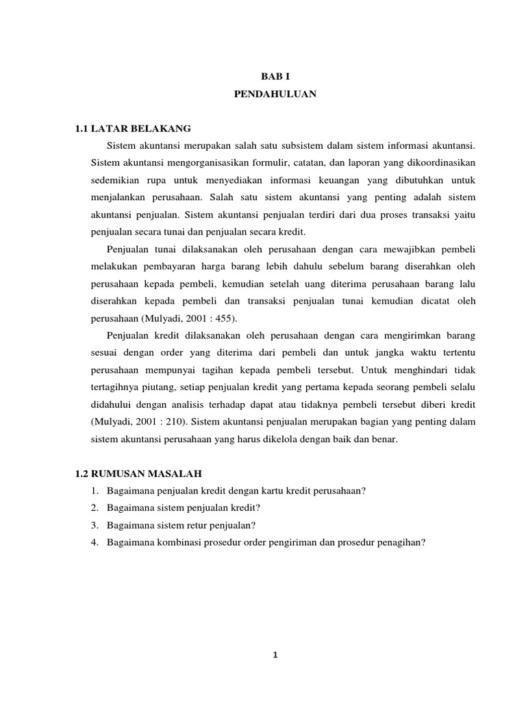 Makalah Sistem Informasi Akuntansi: Penjualan [34wm3x8g9jl7] Sistem penjualan digunakan untuk menangani transaksi penjualan barang atau jasa, baik secara kredit maupun secara tunai. Dalam transaksi penjualan kredit, jika order dari pelanggan telah dipenuhi dengan pengiriman barang atau penyerahan jasa untuk jangka waktu tertentu perusahaan memiliki piutang kepada pelanggannya. (DOC) Sistem Informasi Akuntansi - Sistem Penjualan Kredit ... FYI, sebagai salah satu contoh makalah SIA tentang Sistem Penjualan Kredit dan Piutang yang disusun oleh Mahasiswa S1 - Akuntansi Sekolah Tinggi Ilmu Ekonomi Indonesia (Rawamangun) , materi diambil dari buku Mulyadi (staf pengajar pada Fakultas