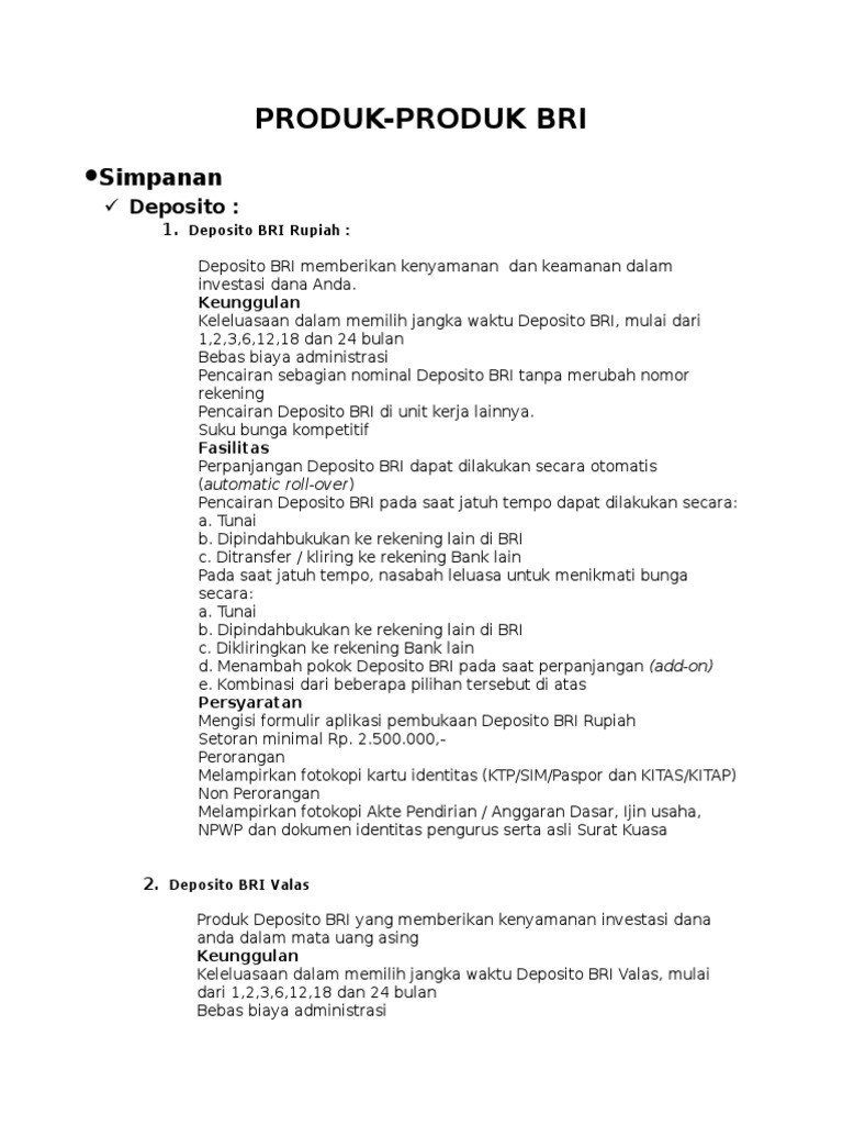Produk Bank Bri - Content Produk bank bri 1) tabungan produk tabungan bank bri di antaranya adalah tabungan britama, simpedes tki, simpedes, haji, britama bisnis, britama dollar, britama valas, britama rencana, britama junior serta tabunganku. Produk bank bri. Sebagai salah satu bank unggulan di indonesia bank bri juga memiliki produk tabungan.